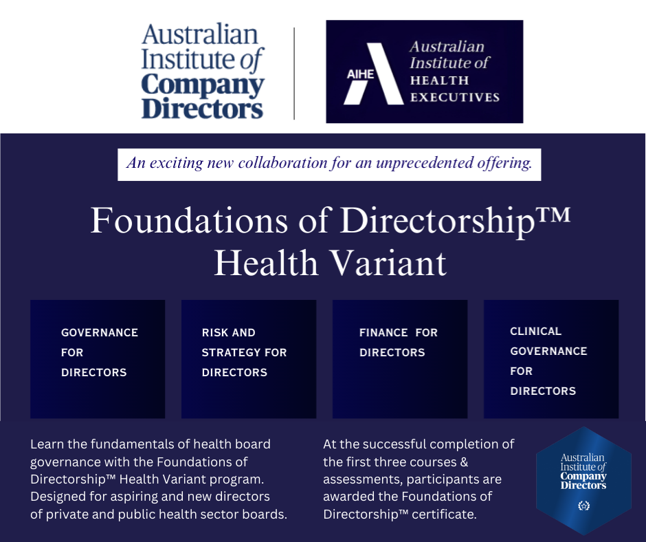 The partnership between the Australian Institute of Health Executives (AIHE) and the Australian Institute of Company Directors (AICD) Foundation offered an extraordinary professional development opportunity.