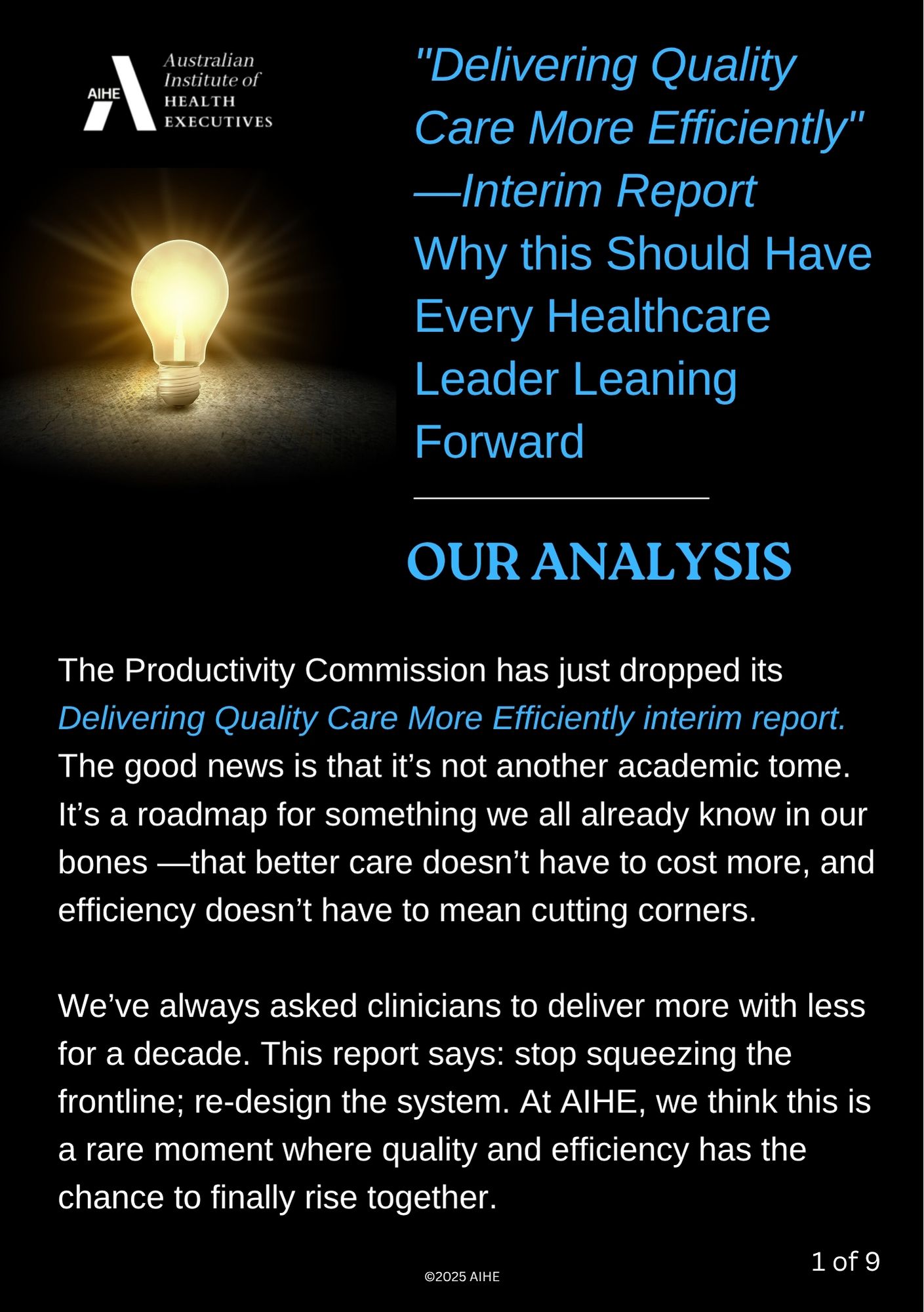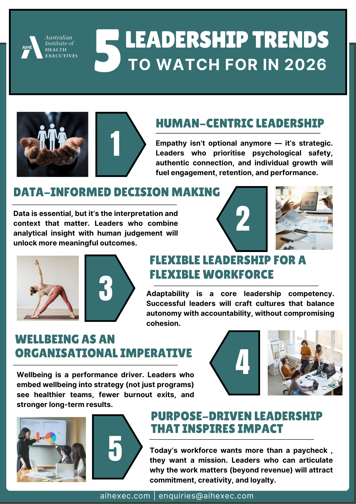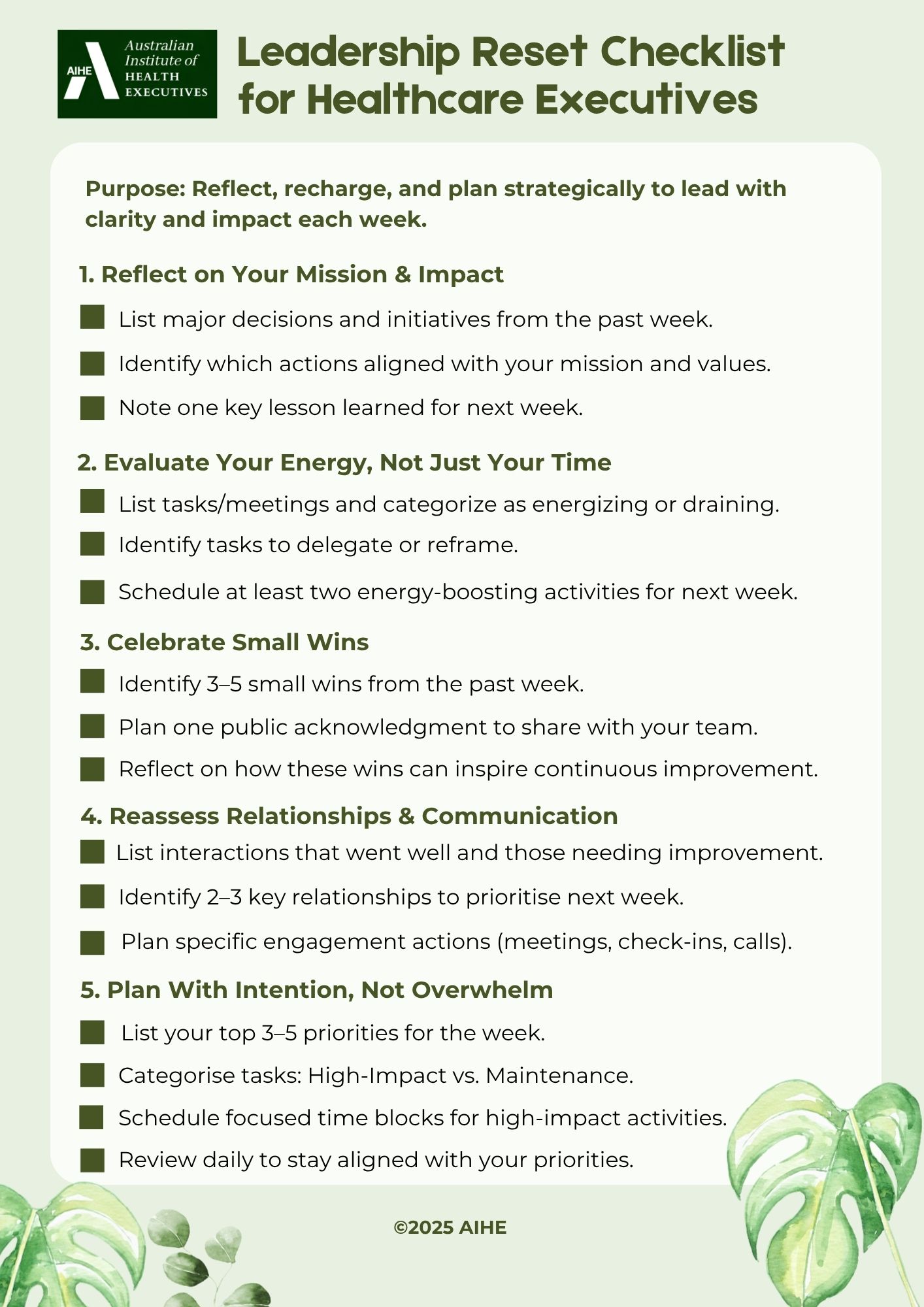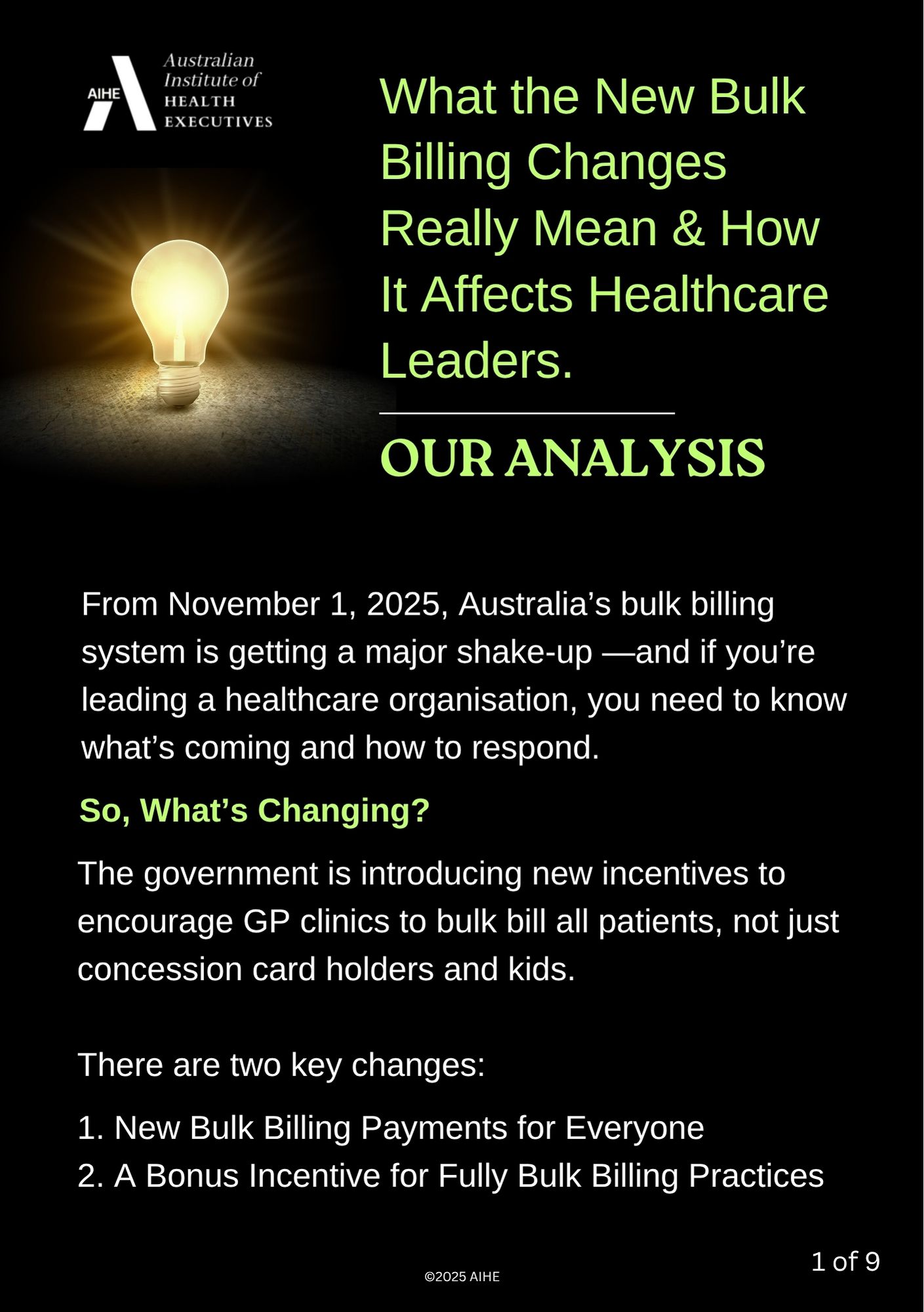 Resources & Tools Clinical GovernanceChecklist for using AI dOWNLOAD High Performance Healthcare Cycle dOWNLOAD Leadership Reset Checklist for Healthcare Executives dOWNLOAD Cheat Sheet - TacklingAged Care Bed Block dOWNLOAD AIHE Analysis - ProductivityCommission Report dOWNLOAD New Bulk Billing ChangesExplained dOWNLOAD Uses for Healthcare AI in the Real World dOWNLOAD Health Insurance Vertical Integration Unpacked dOWNLOAD Puppet Leadership in Healthcare Explained dOWNLOAD Clinical Governancefor Board Directors dOWNLOAD Project Strategic Feasibility Assessment Matrix dOWNLOAD Private vs Public SectorLeadership Comparison dOWNLOAD High Reliability Organisation (HRO) Readiness Checklist for Healthcare Leaders dOWNLOAD Leadership Trends to Watch for in 2026 dOWNLOAD